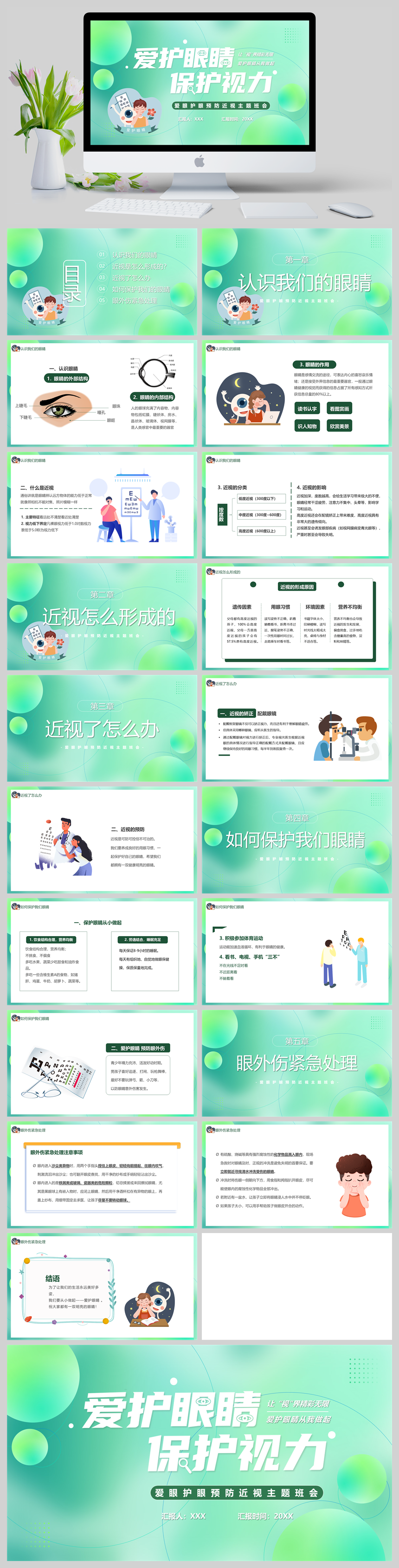 绿色渐变风爱护眼睛保护视力预防近视主题班会PPT模板