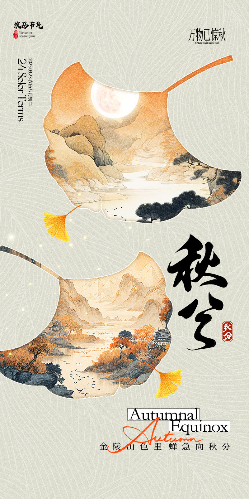 首页 PSD模板 简约二十四节气秋分水墨山水银杏海报