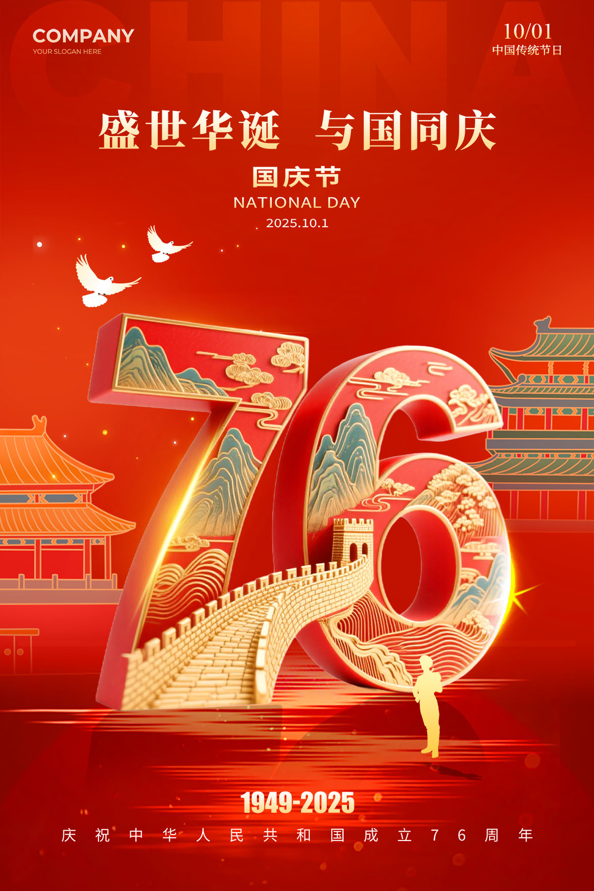 红色国潮风格2025国庆国庆节76周年宣传海报国庆节海报