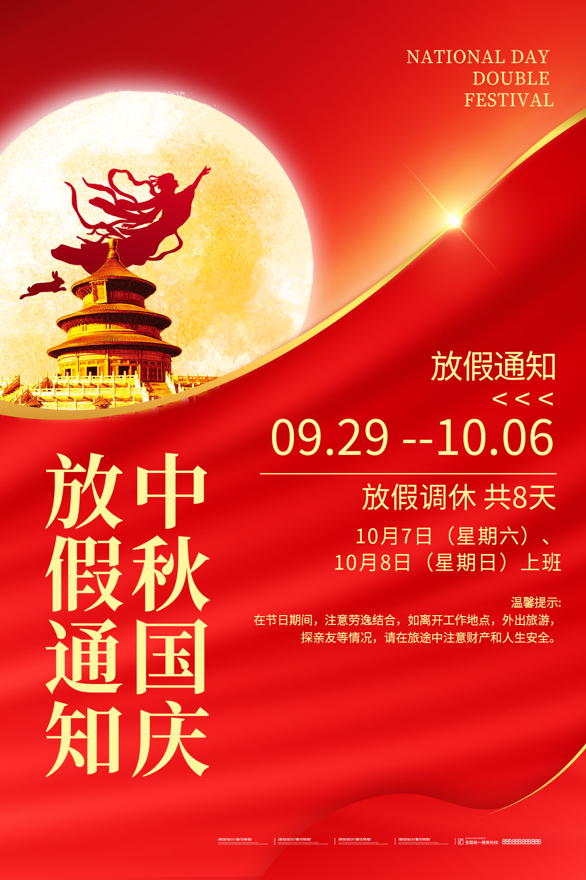 红色中秋国庆十一放假通知海报