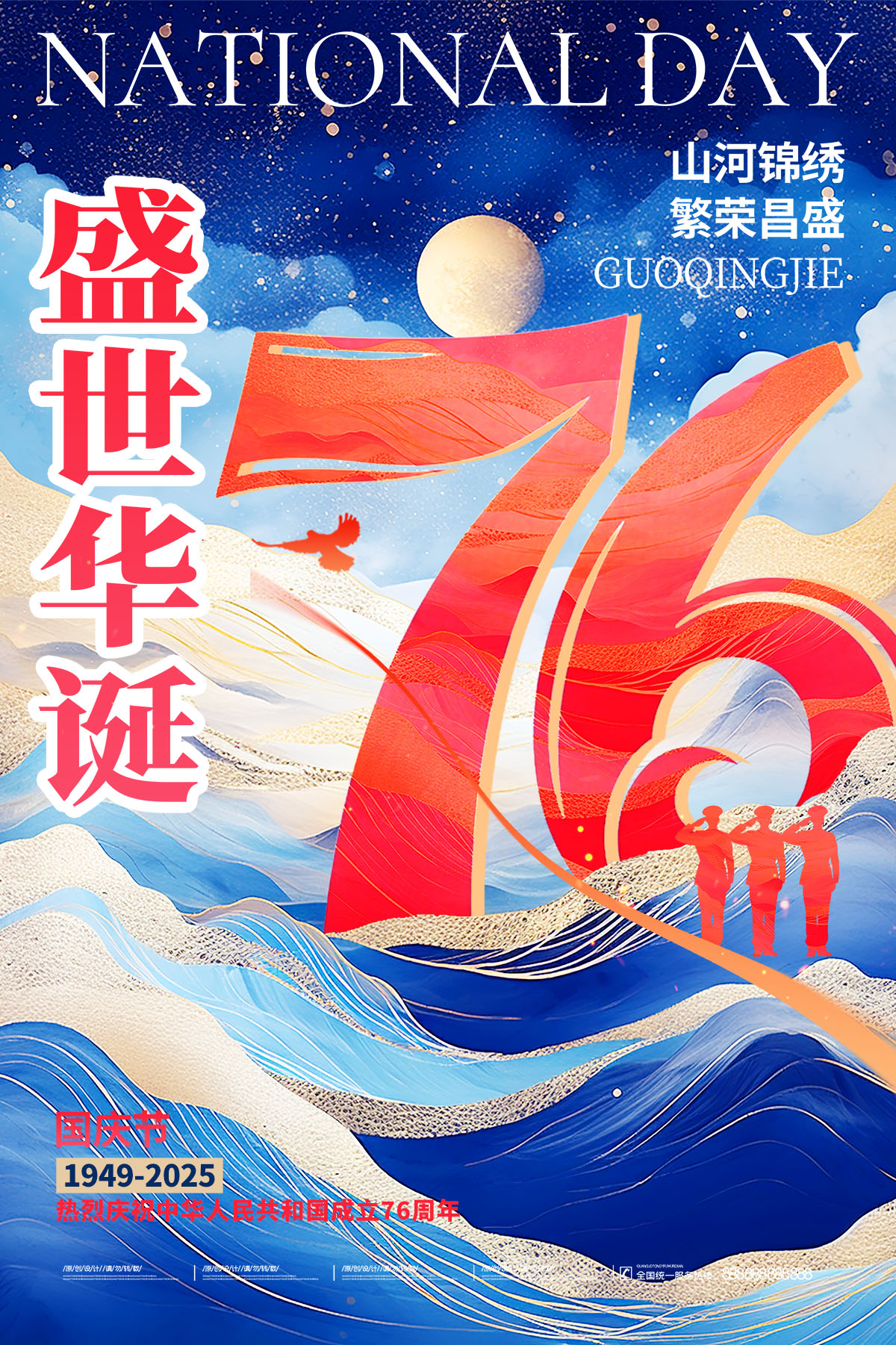 蓝色国潮2025创意盛世华诞十一国庆节76周年海报国庆节海报