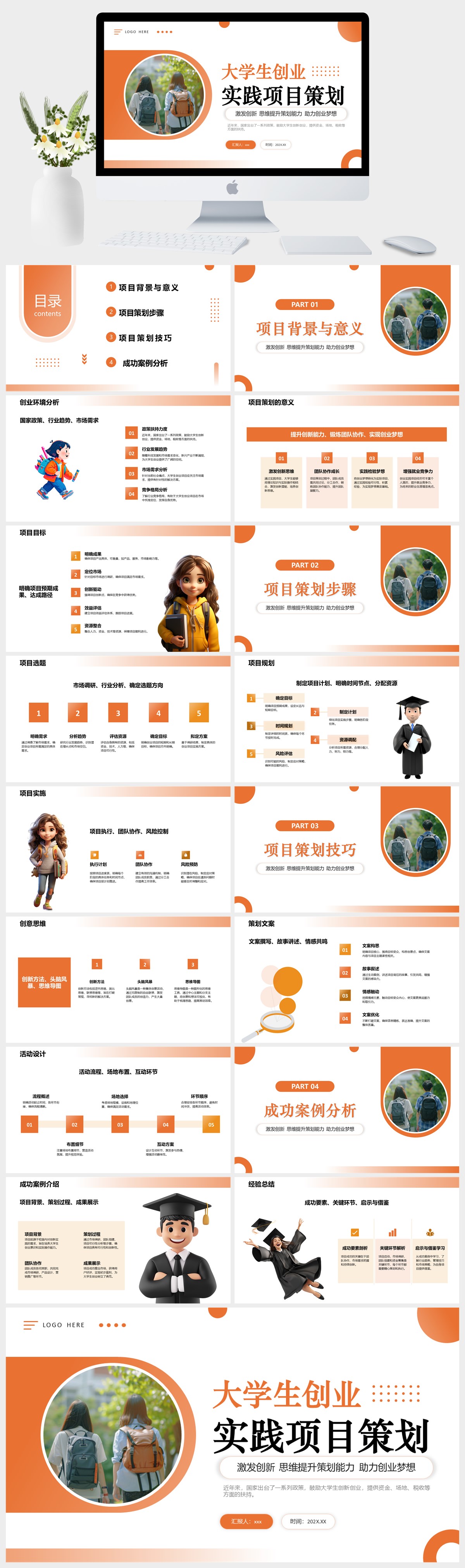 渐变橙色简约大学生创业项目策划PPT模板