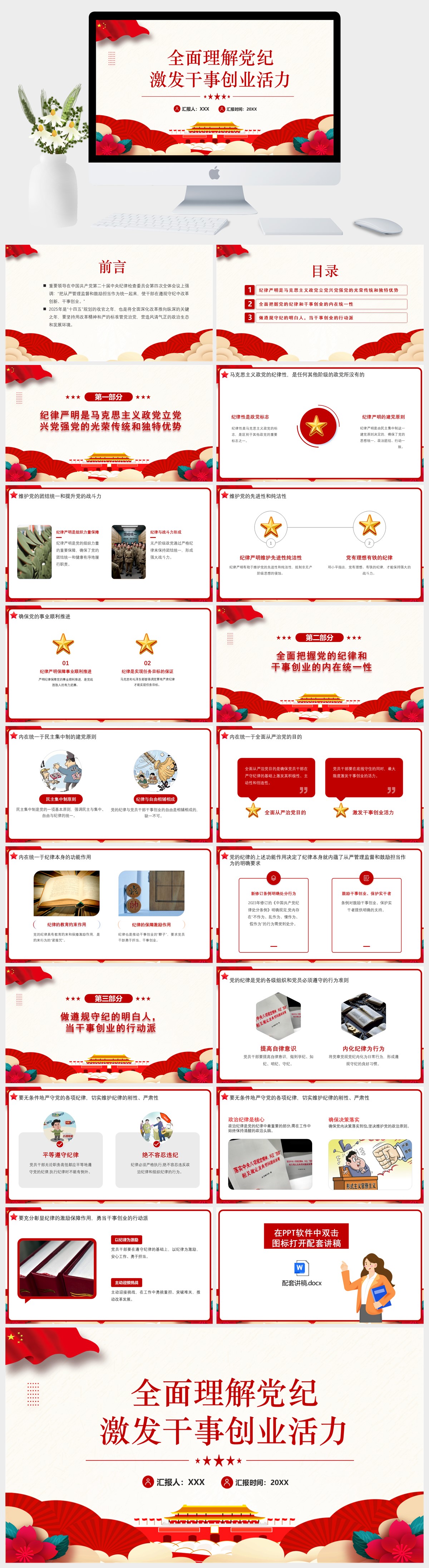 红色党政风全面理解党纪激发干事创业活力党课PPT模板
