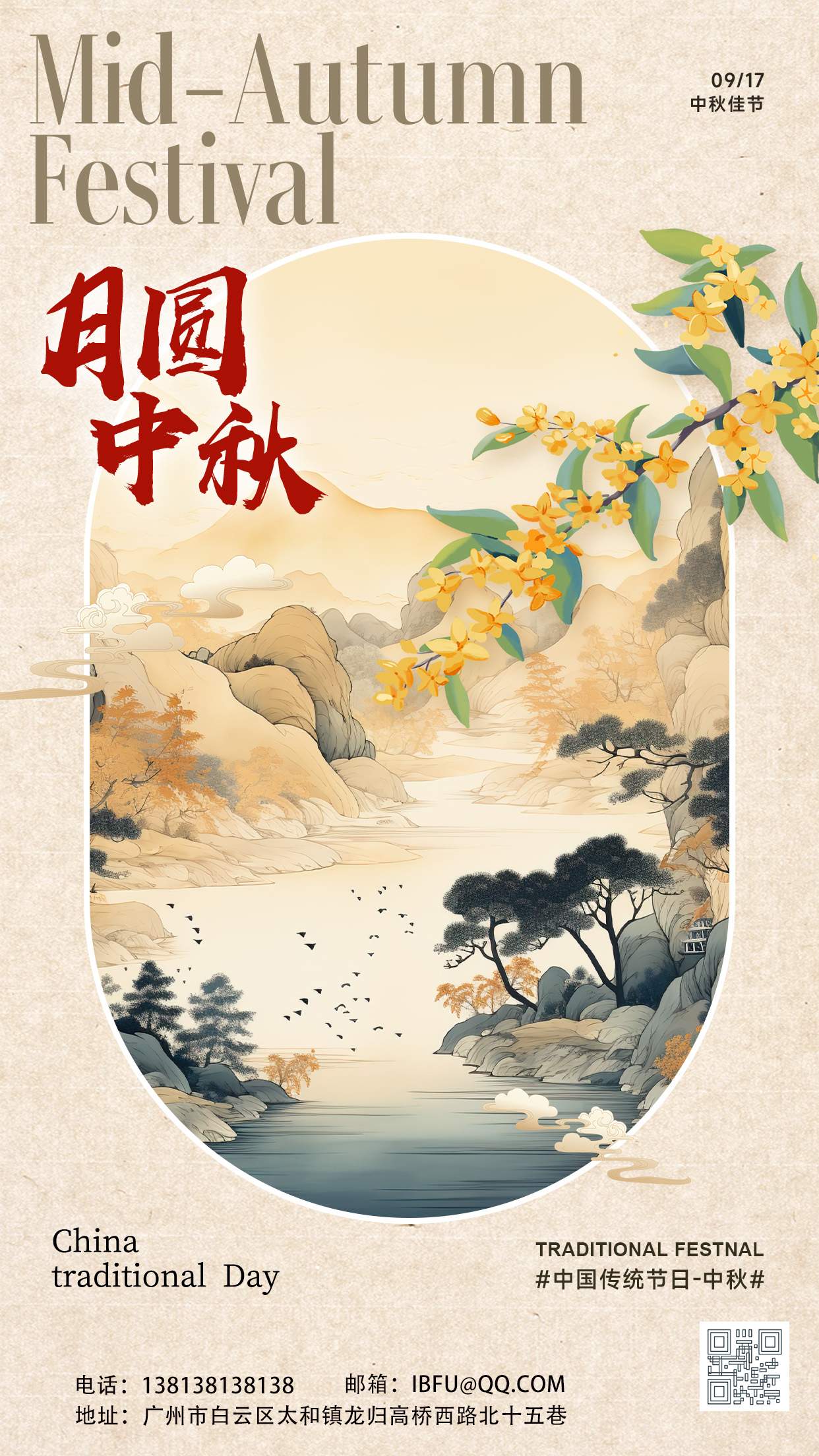 中秋节山水桂花浅灰色新中式古风中国风海报海报