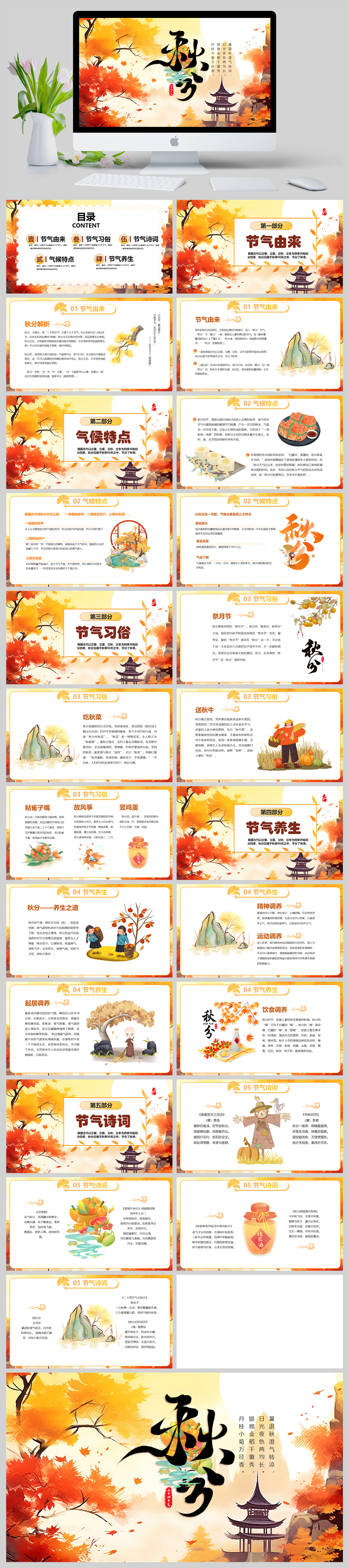 手绘水彩黄色二十四节气秋分介绍PPT模板