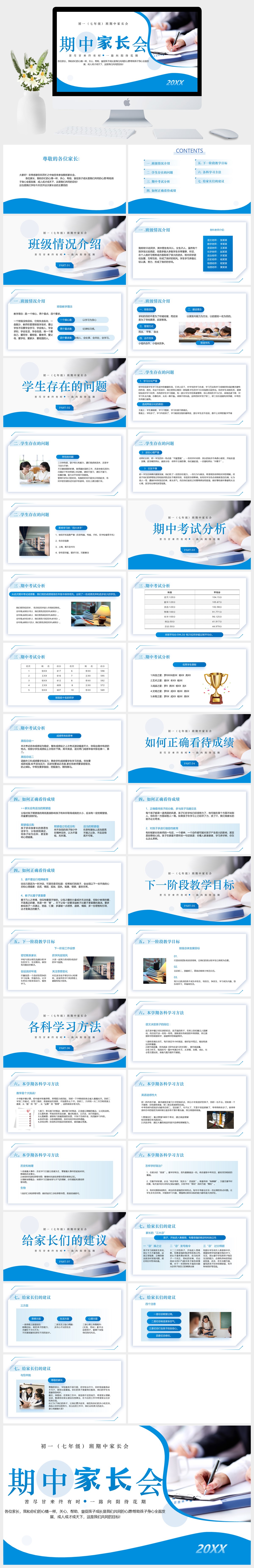 蓝色简约初一(七年级)班期中家长会PPT模板