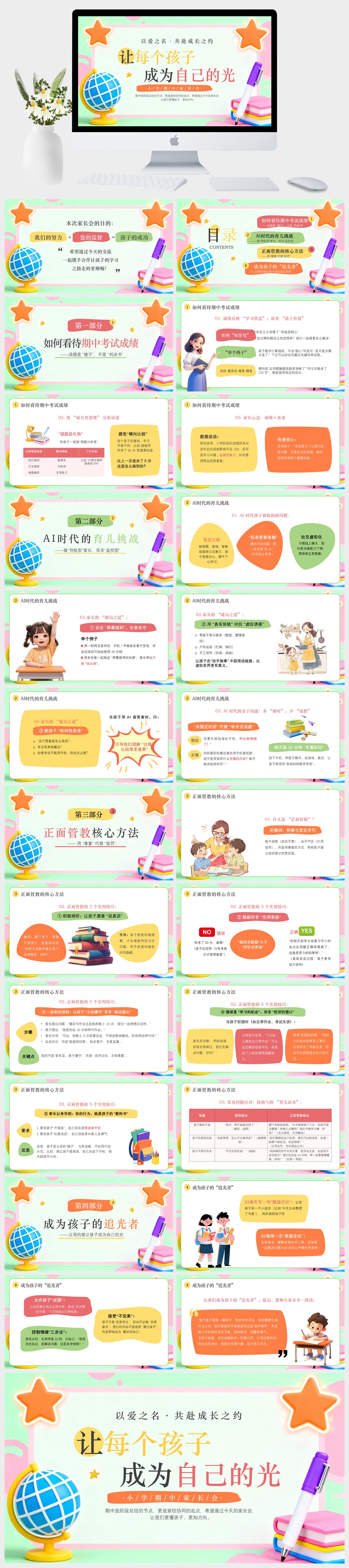 卡通风小学期中家长会让每个孩子成为自己的光PPT模板