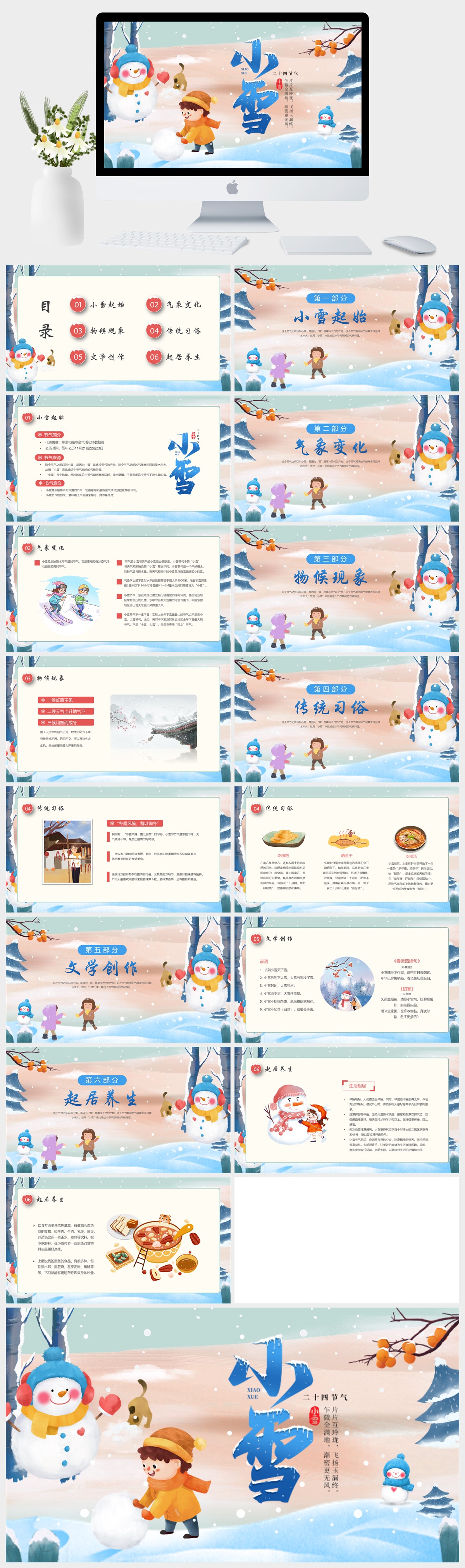 手绘小清新传统二十四节气小雪节气介绍PPT模板