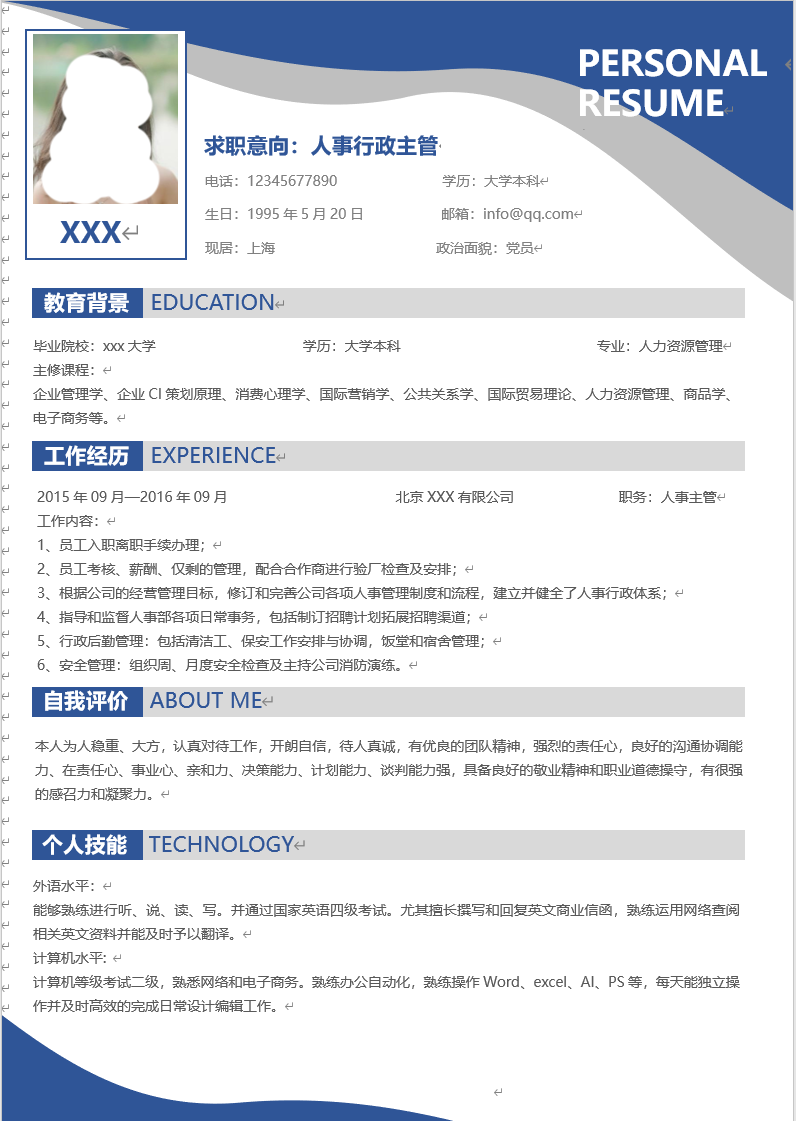 简约人事行政主管简历个人简历简历word简历