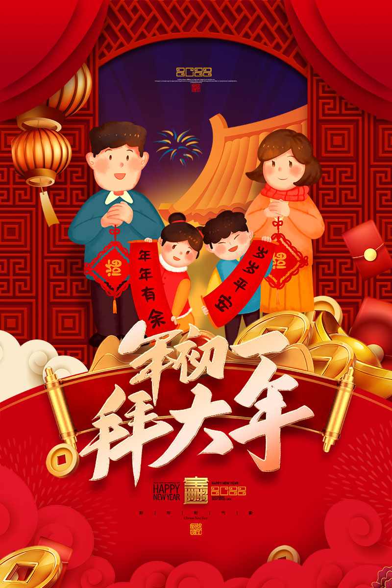 红色喜庆大年初一拜大年新年系列插画海报设计