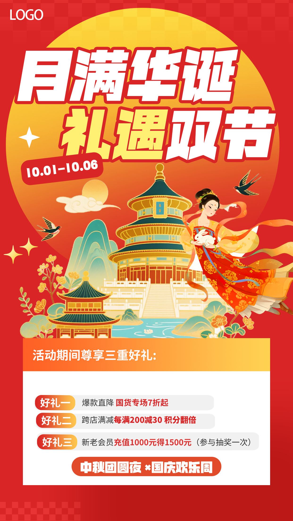 红色渐变2025月满华诞礼遇双节中秋国庆活动促销海报